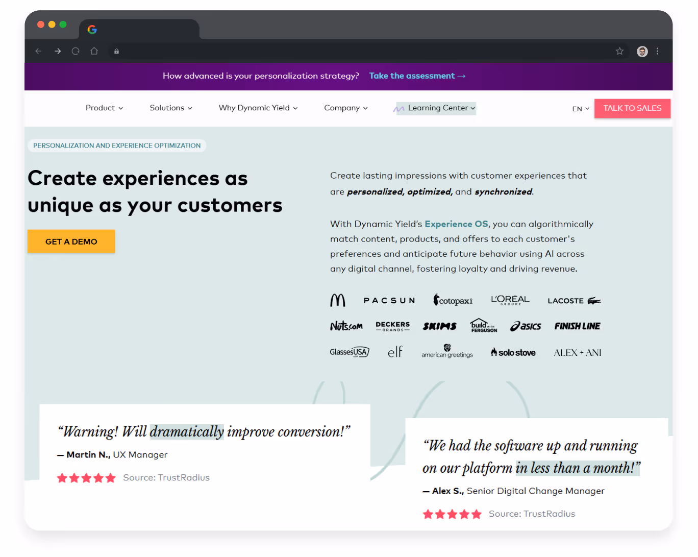 Dynamic Yield is an online personalization platform by Mastercard that features a built-in AI tool, AdaptML, designed to create a unique user experience. The platform is known for its extensive functionality and robust A/B testing options.