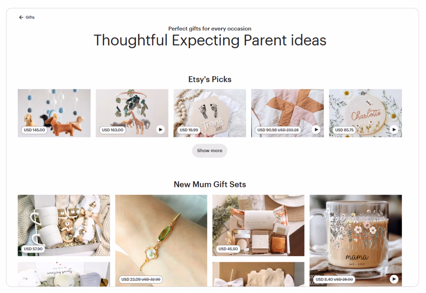 The idea is simple: a user launches Gift Mode or clicks the corresponding icon/section on Etsy and answers a few questions about the person they’re shopping for.