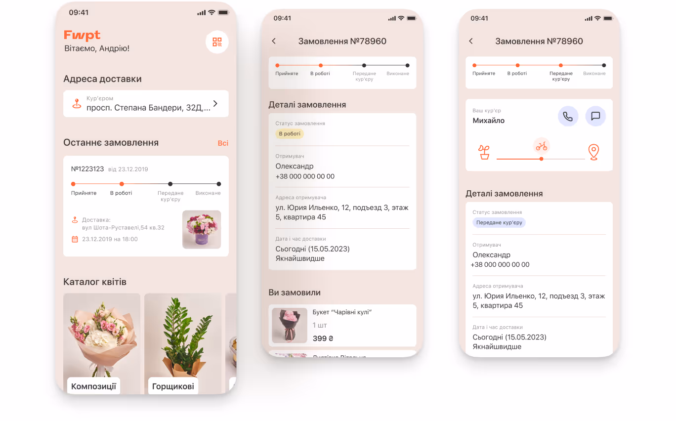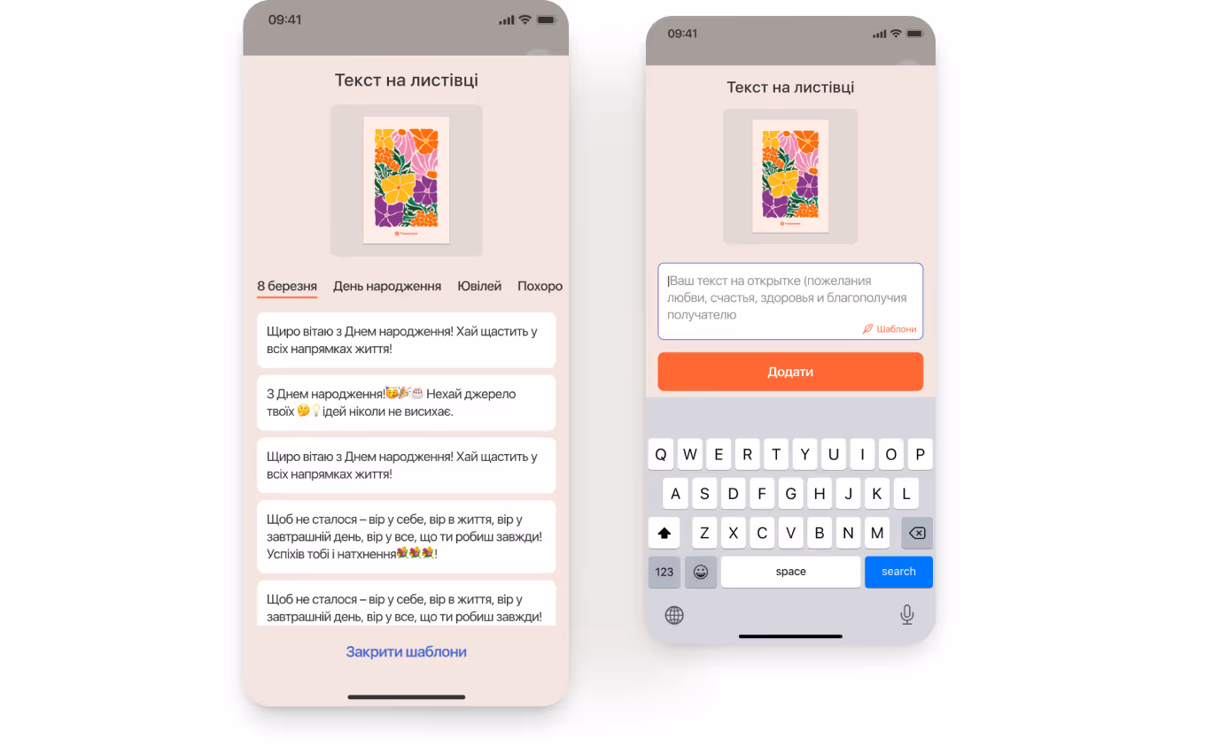 Analytics showed that customers most often buy cards and sweets along with flowers. So, for their convenience, the app offers templates with greetings for various occasions — buyers can write their own text or choose a ready-made option.