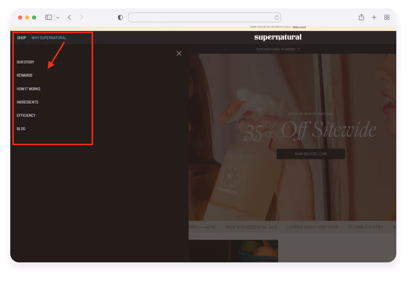Supernatural — a website for a cosmetics brand that specializes in natural and eco-friendly products. The web design of this website is the best example of how brands can emphasize their philosophy and create a unique emotional experience for users via UX/UI solutions like: