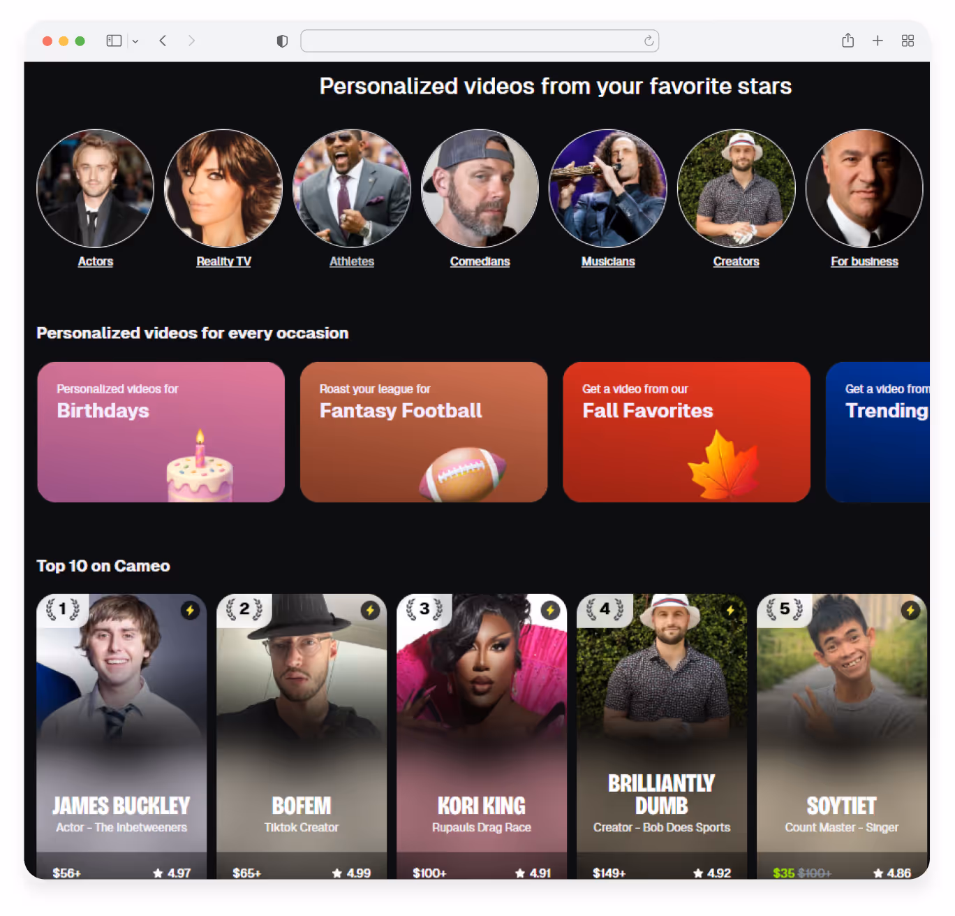Cameo is a startup platform where users can order personalised videos from their favourite celebrities, actors, athletes, or influencers. However unusual the company’s services might seem, the interface presents and explains them eloquently.