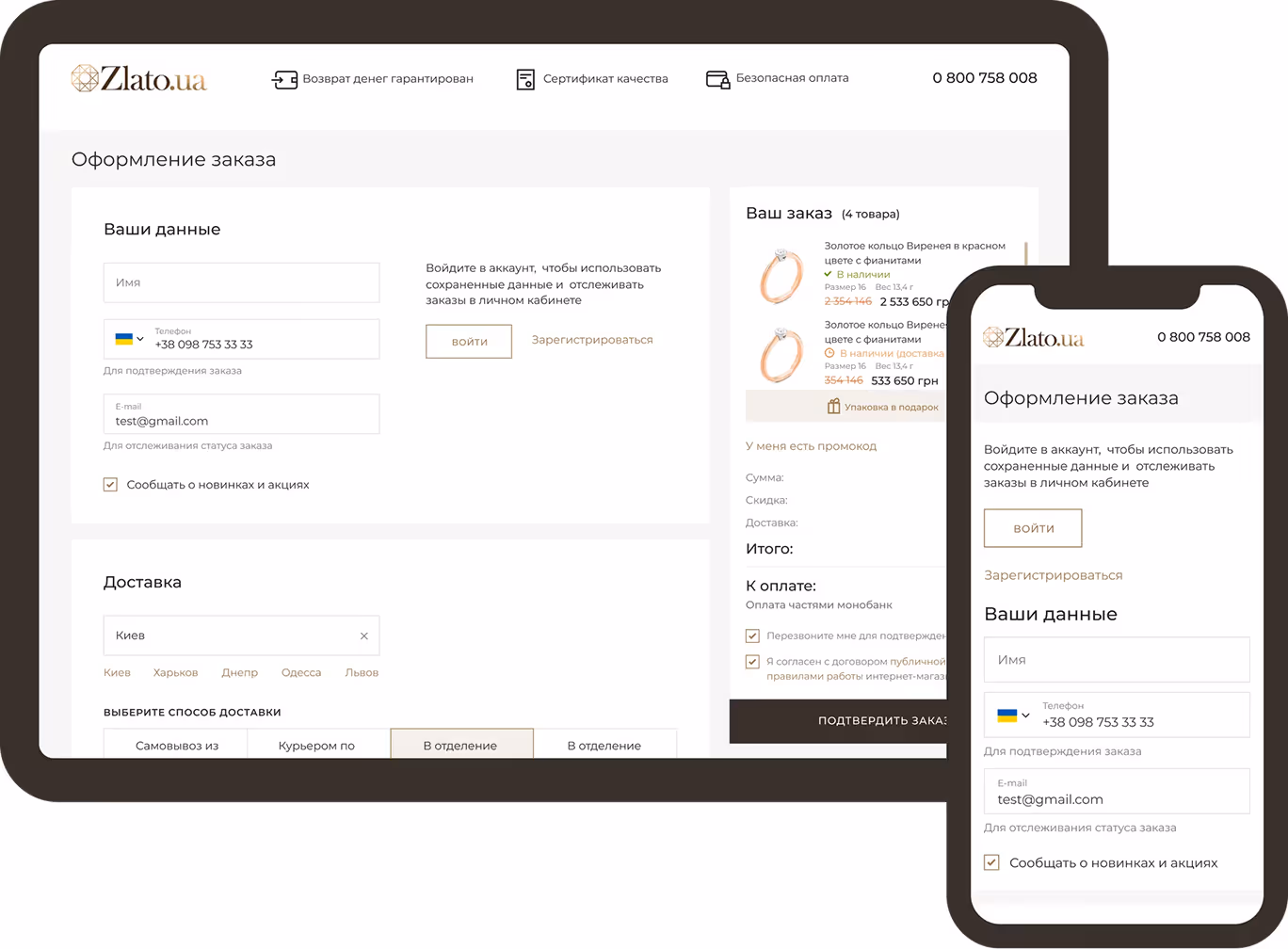For example, while working on the Zlato.ua website redesign, we revealed that the checkout page was lengthy and complicated. So, we simplified it, restructured the order form, and split it into semantic blocks by means of visual accents.