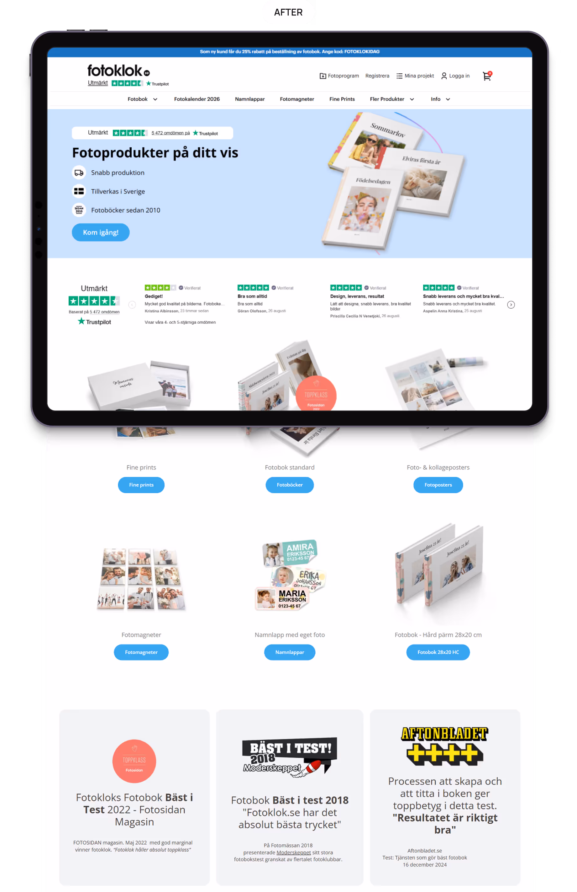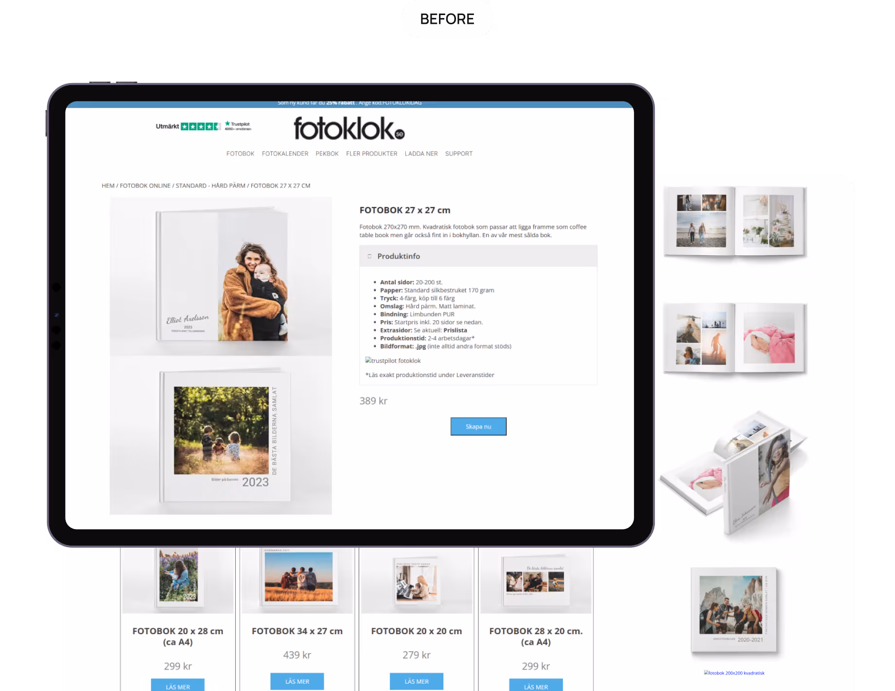 The design felt outdated, navigation was clumsy, and SEO rankings for “fotobok” and “fotokalender” were unstable, while the user journey felt disconnected. So we joined forces with SEO agency TopDog and Fotoklok to make the site welcoming, trustworthy, and ready to grow.
