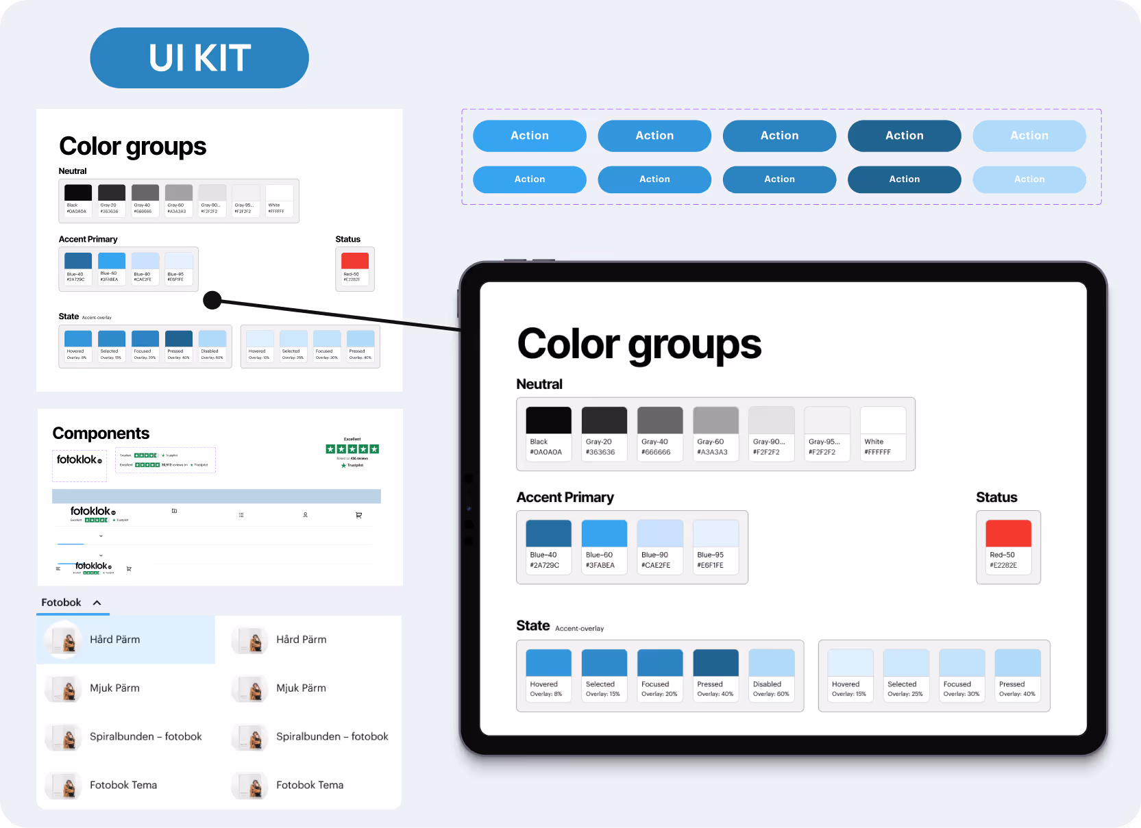 To ensure Fotoklok could grow without losing its identity, we created a UI kit with all the essentials — typography, buttons, icons, color palettes, and reusable components in every state.