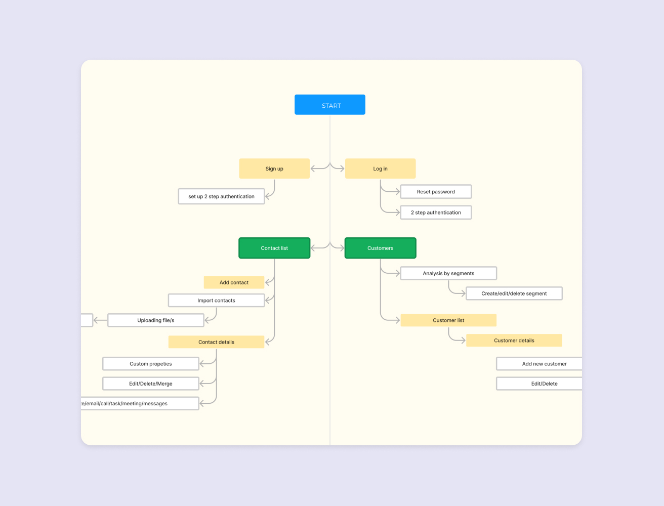 A simplified structure of the product that shows how pages, sections, and key features are organized and connected.