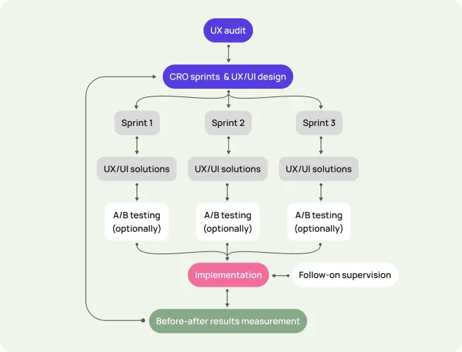 We utilize our own time-tested CRO approach. Instead of risking a total overhaul, we improve your product in agile, high-impact sprints. - We offer multiple CRO models—from subscription and fixed-price to classic approaches—so you can pick what fits your business and budget. - Unlike many agencies, our strength is a strong, analytics-driven UX team that makes improvements that work long-term, not just temporary changes that win A/B tests but fail in real life. - We make changes step by step, so you can see results quickly with low investment.